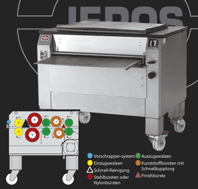 Weitere JEROS-Vorteile: - Bewegliche, einstellbare Rahmenlagerung der Reinigungsbürsten - Beschwerdefreies Arbeiten durch 95 cm Maschinenhöhe - Andere Maschinenhöhen ohne Aufpreis - Edelstahlgehäuse - Mit Schnellreinigungssystem für die Reinigungsbürsten